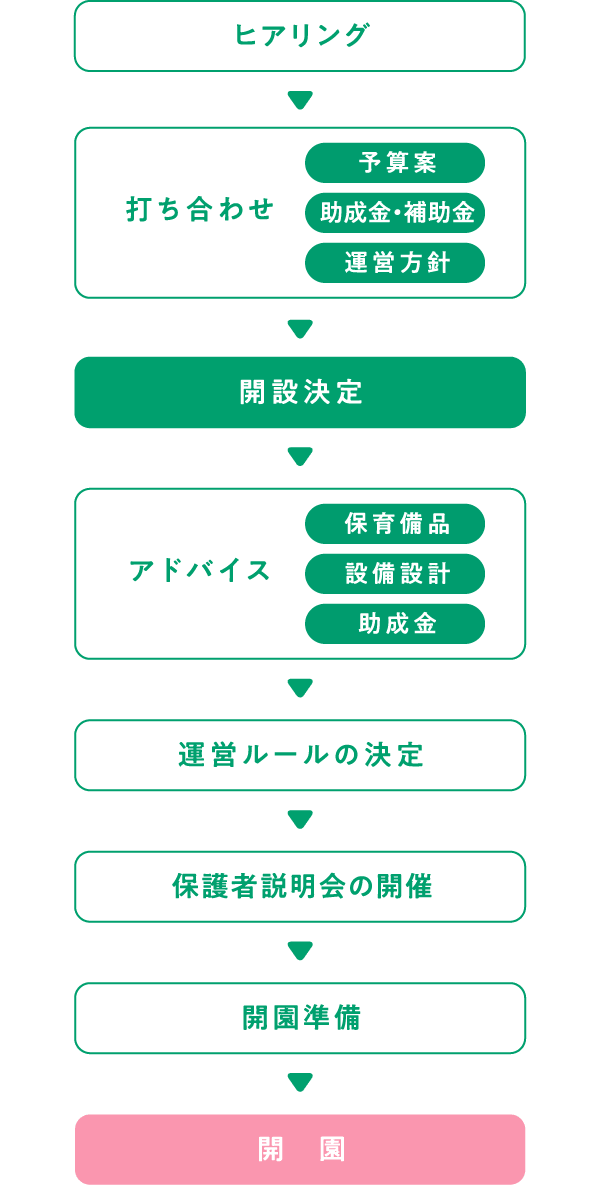 条件により異なりますが、ヒアリングから開園まで半年程度必要となります。ただ、それよりも短期間で開設することも可能です。