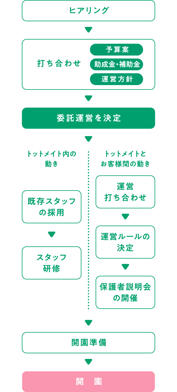 条件により異なりますが、委託決定から開園まで半年程度必要となります。ただ、それよりも短期間で開設することも可能です。